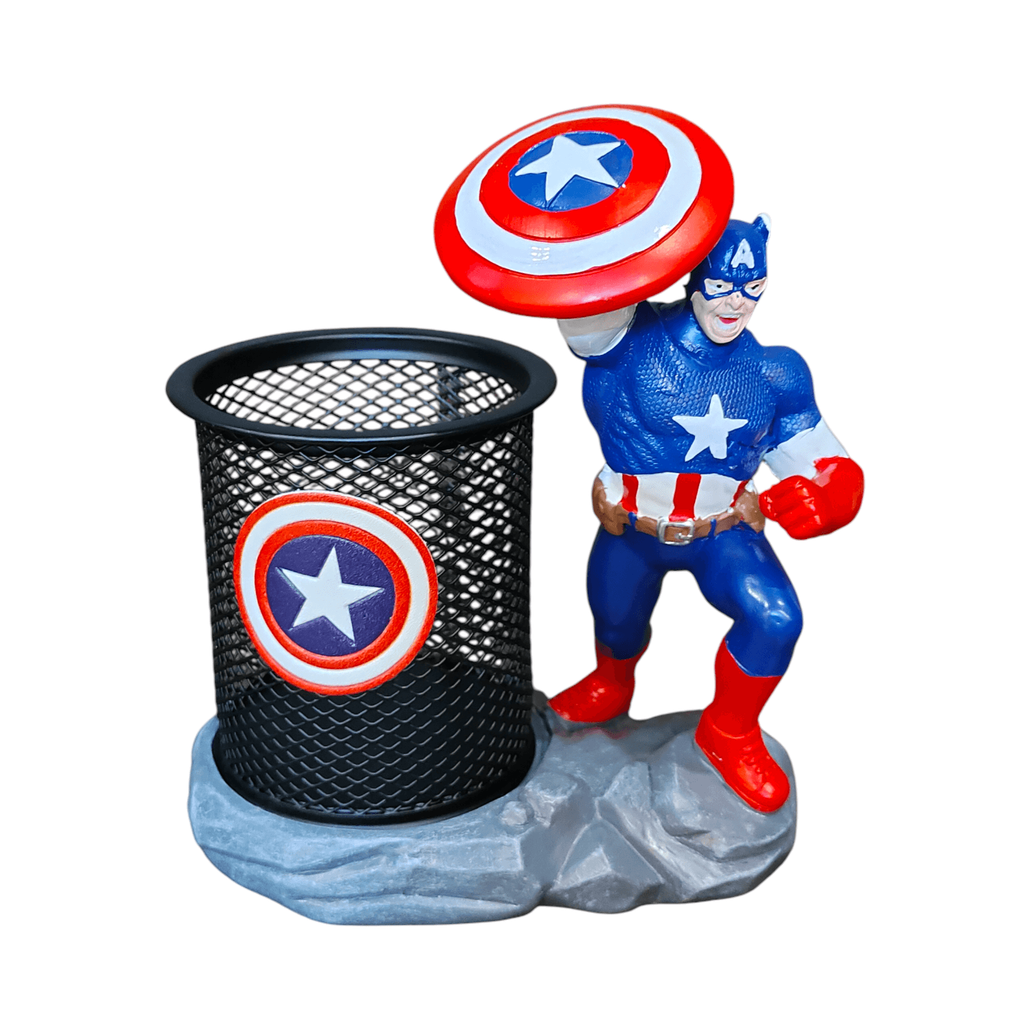 • Iconic Superhero Design – Features a Captain inspired cartoon figurine holding the famous shield, bringing a heroic theme to your desk.