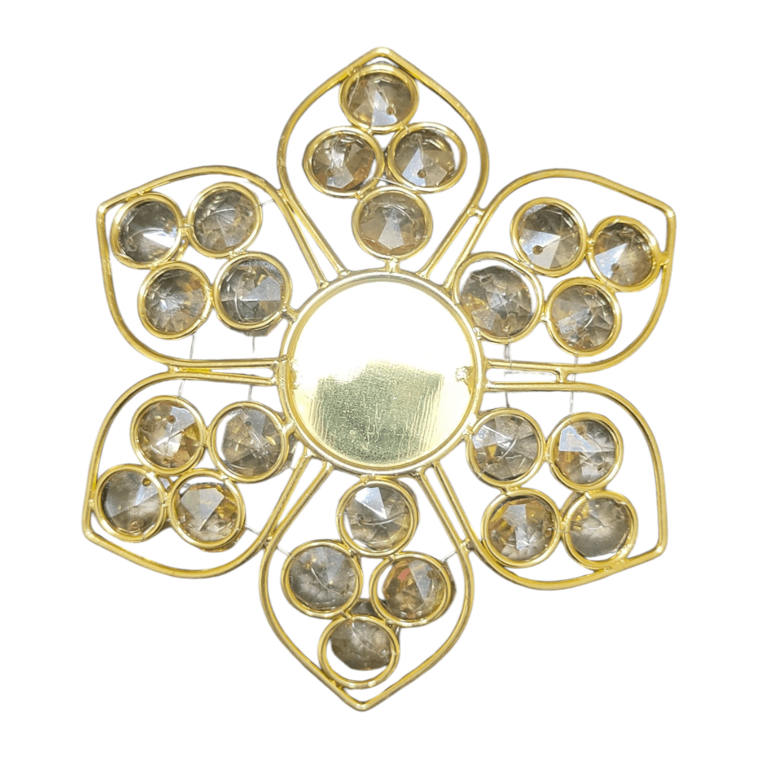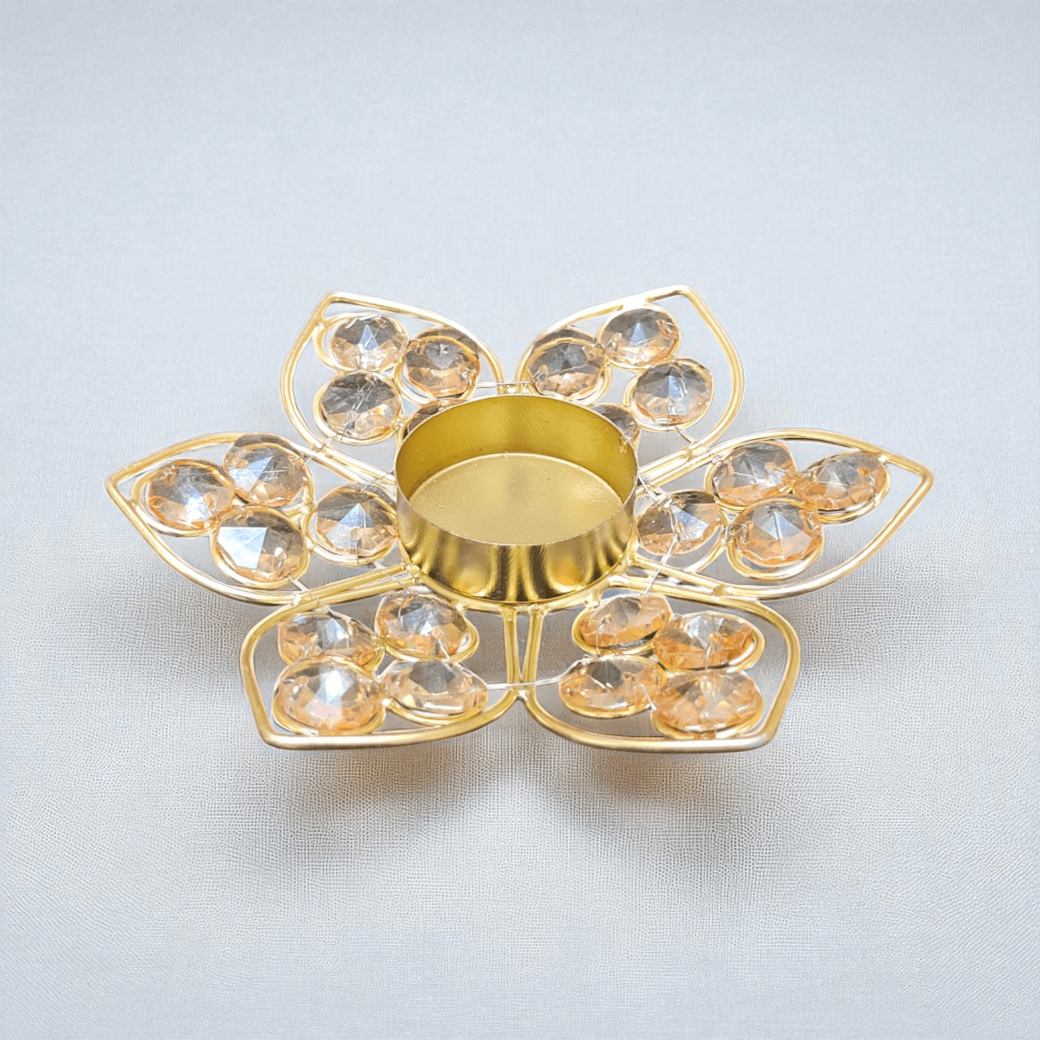 - Decorative tealight holder crafted in a lotus flower shape, featuring six petals adorned with sparkling crystal gems.