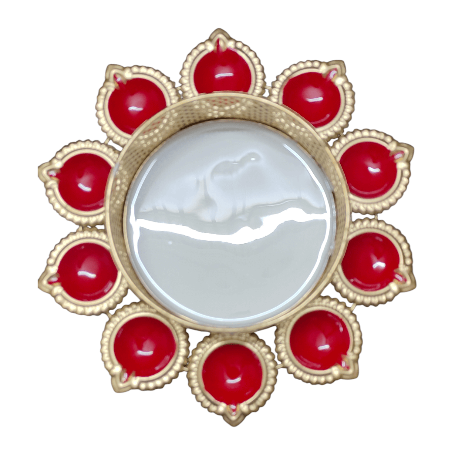- Elegant Design: Golden metal lattice-style holder surrounded by red diya shapes for a festive look.