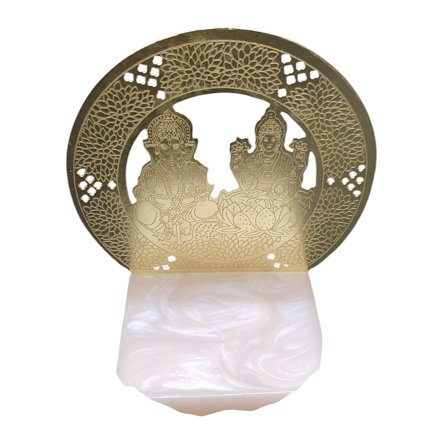 - Elegant chowki (altar stand) featuring a finely cut golden metal plate with detailed images of Goddess Lakshmi and Lord Ganesh.