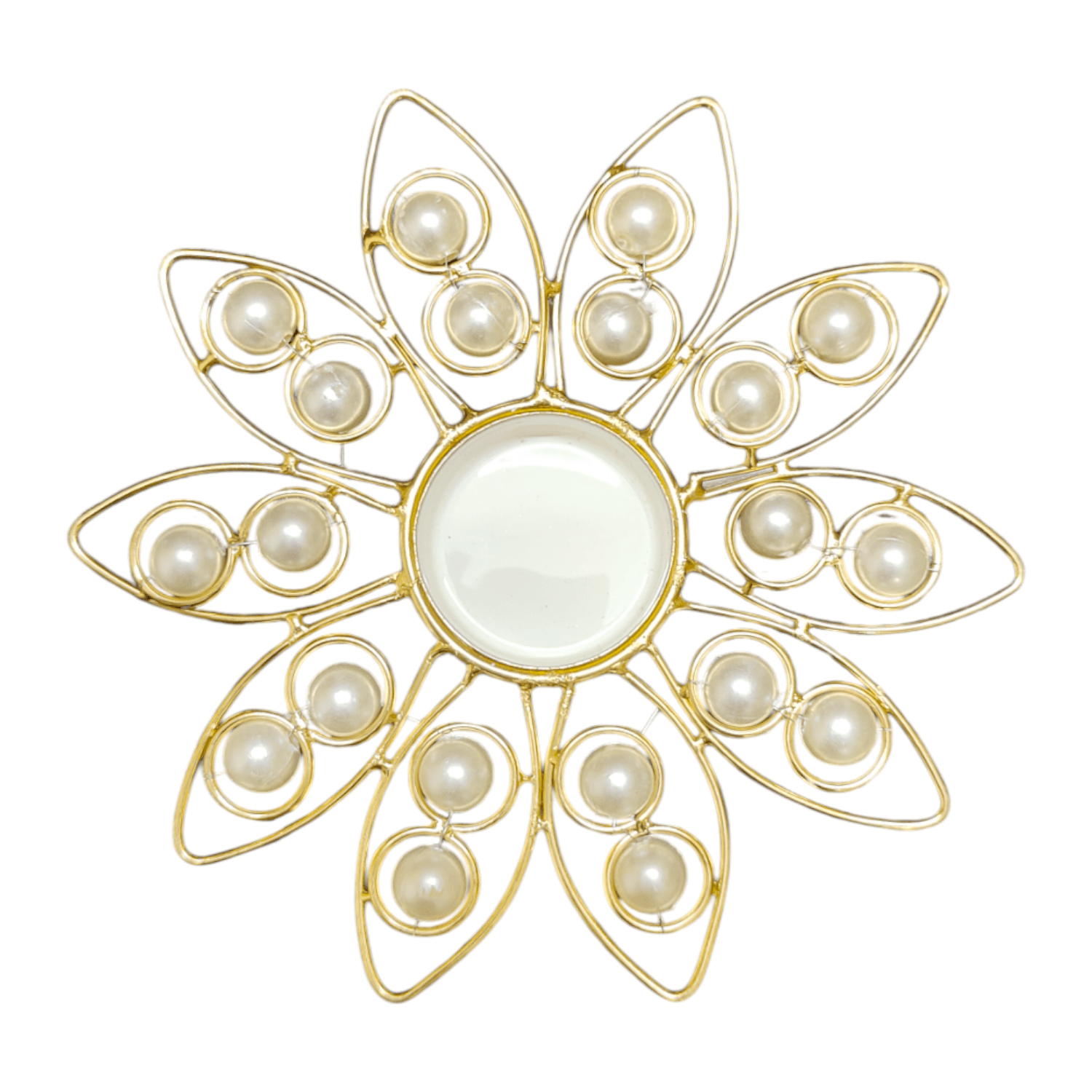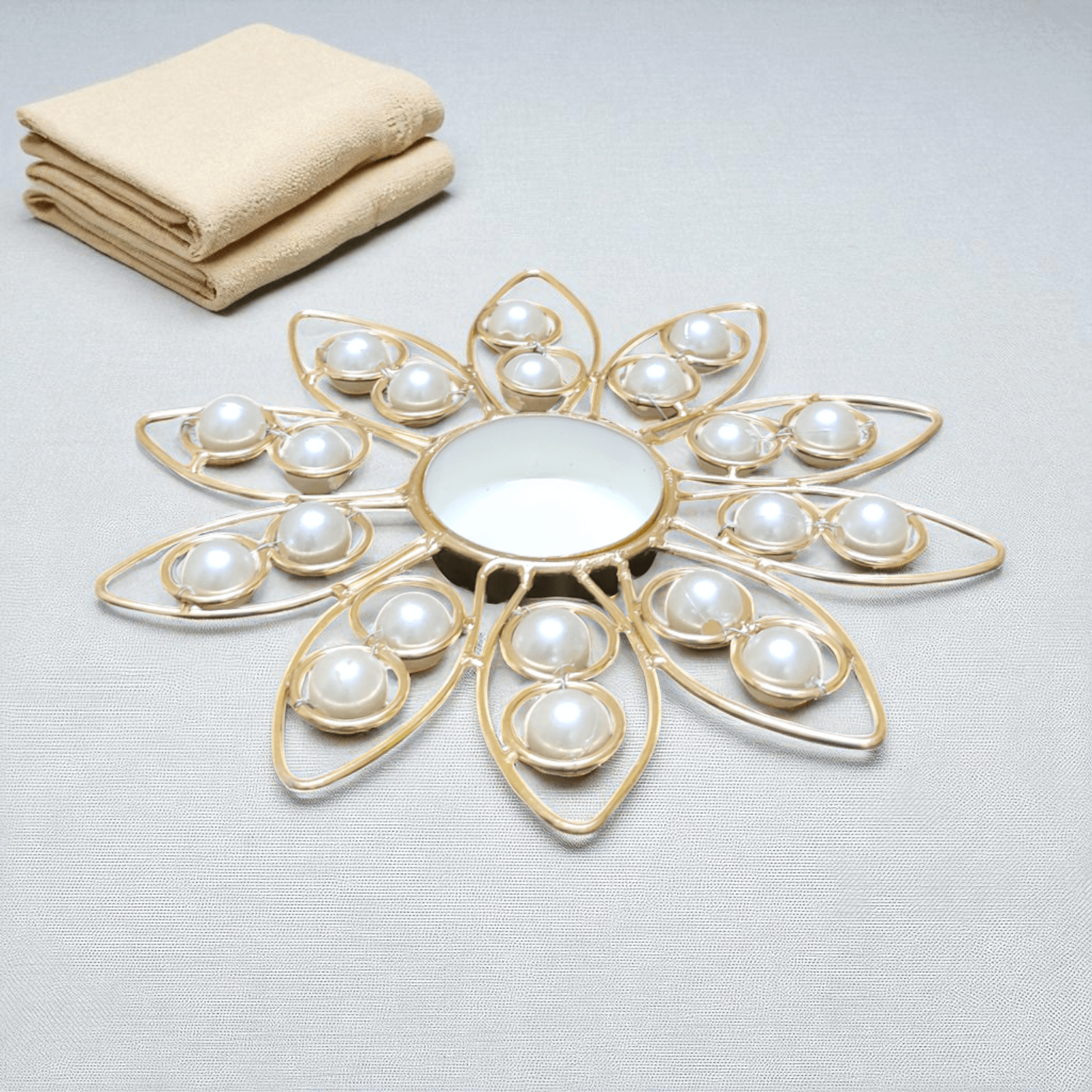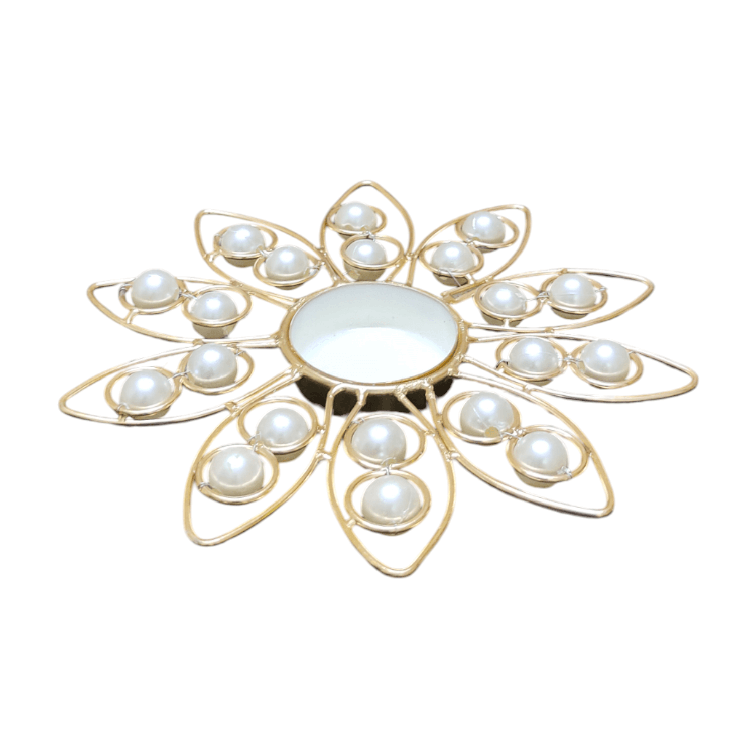 - Beautiful tealight holder in a floral design, crafted with gold-toned metal petals embellished with glossy faux pearls.