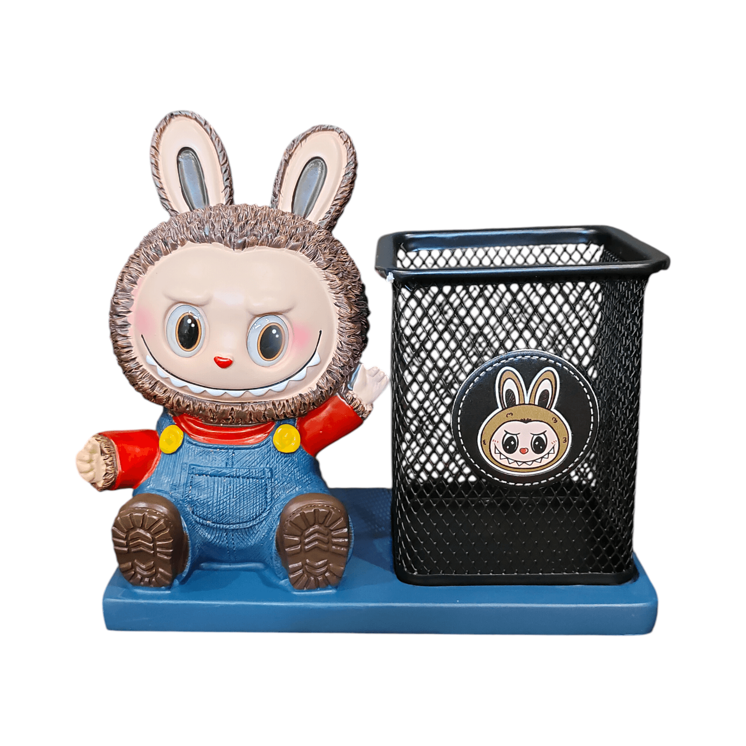 - 2-in-1 Desk Organizer – Decorative resin figure + attached metal mesh pen holder for neat storage.